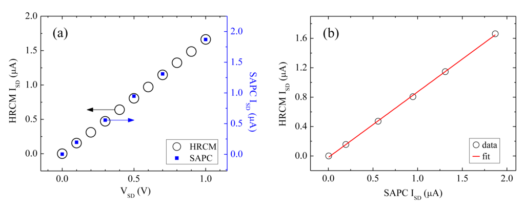 The SAPC is calibrated to the HRCM (PXI-4071; 1-pA resolution, NI) by ISD-VSD measurements of the CNT sensor varying VSD from 0 to 1 V as shown in Figure 5(a). The HRCM current value against the SAPC current value obtained from Figure 5(a) fits well by using the linear least square fitting method as shown in Figure 5(b), where the fitting parameters of the slope and the intercept are 0.892 and −1.94 × 10−8 A, respectively and the value of the adjusted R-square is 0.999. Using this result, The SAPC current value is calibrated to the HRCM current value as shown in Figure 5(b).