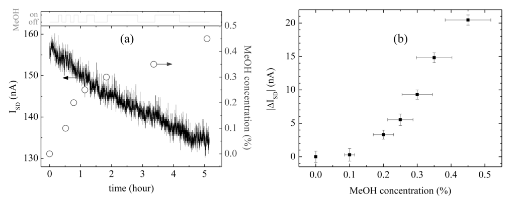 Figure 6(a) shows the results of measuring methanol vapor concentration with the CNT sensor and with the commercial methanol vapor detector, where the methanol vapor flow was controlled by opening (‘on’ state in Figure 6(a)) or closing (‘off’ state) the lid of the bottle of methanol solution as shown in the setup of Figure 4. We waited until the electrical current value of the SAPC was stabilized before each measurement of the concentration of methanol vapor was carried out by using the commercial methanol vapor detector. The lid of the bottle of the methanol solution placed on the hotplate at 50 °C was open to diffuse methanol vapor with high velocity dispersion for a while, and was closed. By repeating the experimental methods described above, the real-time measurements of the electrical current of the SAPC and measurements of the methanol vapor concentration is shown in Figure 6(a). The temperature inside of the glove box remained almost constant around 28 °C during the entire measurement process. The conductance of the CNT sensors is known to decrease by reducing gases [25], which coincided well with our experimental results that the electrical current decreased according to the increase of the concentration of methanol vapor, which is also a reducing gas [26]. Figure 6(b) shows the concentration of the methanol vapor measured by the commercial methanol vapor detector against electrical current variation (|ΔI| = |Ic-I0|) of the CNT sensor from Figure 6(a), where Ic is the measured stabilized-electrical current value after increasing methanol vapor concentration and I0 is measured stabilized-electrical current value in ambient air. The electrical current variations significantly increase with the concentration of methanol vapor.