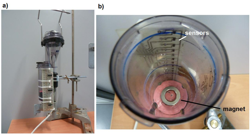 An array of 24 sensors (A1301), placed with a linear separation of 8 mm, was constructed. The total length of the array of sensors was of 184 mm. Because of constructional reasons, the upper sensor was placed close to the edge of proportional measurement device. A total of five sensors protruded below the lower edge of the container. The array was placed on the outside of the cylindrical milking measuring device, parallel to its axis, so that its internal washing with acid and basic detergents and hot water does not interfere in the array.