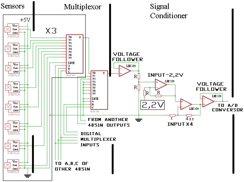 As shown in Figure 2 the array was multiplexed with four 8-channel analog multiplexer (4051N) with the intention of obtaining a single signal, which was conditioned by four operational amplifiers contained in a LM324. The four operational amplifiers were connected in the following order: the first as a voltage follower, the second subtracts 2.2 V to the input signal, the third multiplies the second signal by five, and the last one follows the tension of the third amplifier.