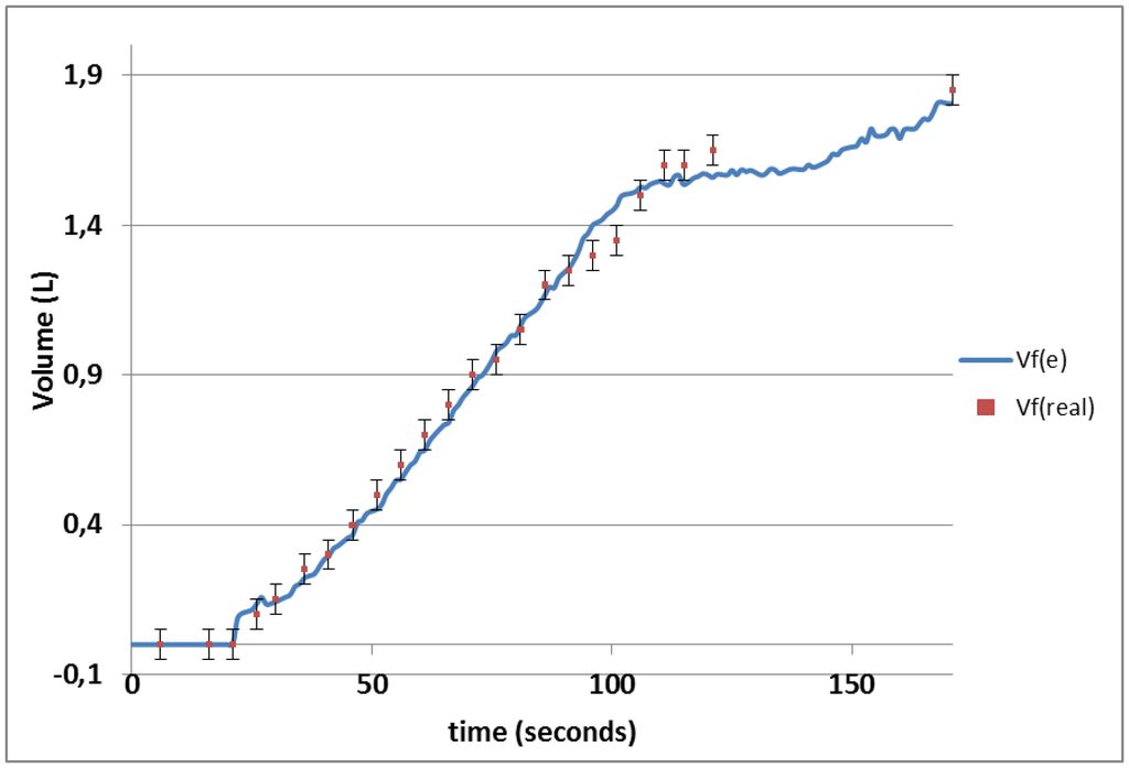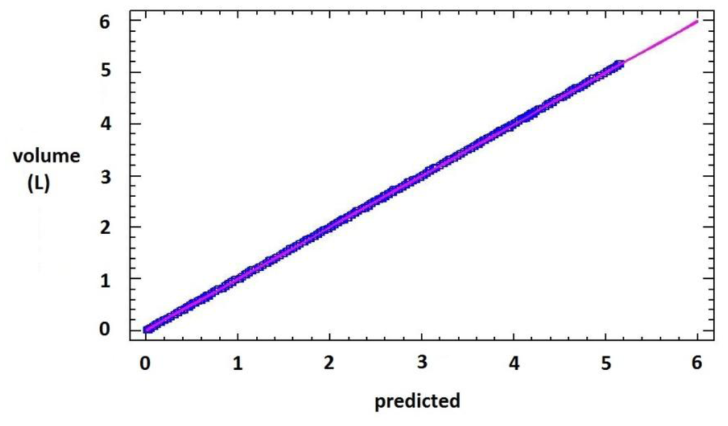 A second linear regression analysis was performed, with dependent variable the manually measured volume (Vf(t)) [] and the predicted volume (Vp(t)) by the calibration model (Table 1) as independent variable. The model fitting is shown in Figure 4, which is a significant model (P-value < 0.01), with intercept near cero and a slope near 1 in Equation (2), a percentage of explanation (R2) of 99.962%, and a mean absolute error of 0.054 L: