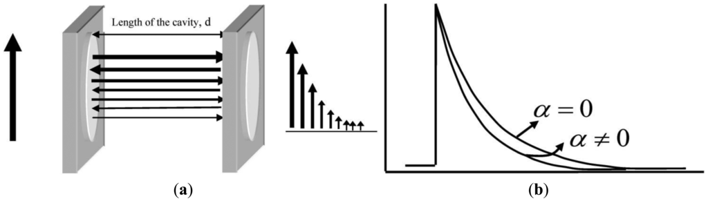 Cavity ringdown spectroscopy (CRDS), first reported in 1988 by O'Keefe and Deacon, is a powerful laser-based absorption spectroscopic technique [34–36]. CRDS, in its simplest form, is implemented by injecting a laser pulse into a stable optical cavity, consisting of two highly reflective mirrors, as shown in Figure 1. When a laser pulse is incident on the back side of the first mirror, the majority of the pulse is reflected away from the cavity; however, a small portion of the beam, based on the finite reflectivity of the mirror, is injected into the optical cavity. When this injected pulse encounters the second high reflectivity mirror, the majority of the remaining pulse is reflected back into the cavity while a minor percentage is ejected from the cavity. The beam effectively reflects back and forth between the mirror surfaces, transmitting a small percentage of its intensity with each mirror encounter. The transmitted intensity usually follows an exponentially decaying profile, as depicted in the figure. The time duration in which the transmitted intensity decreases to 1/e of the incident intensity injected into the optical cavity is called the ringdown time (τ). The ringdown time constant for the exponential decay is given by the following: