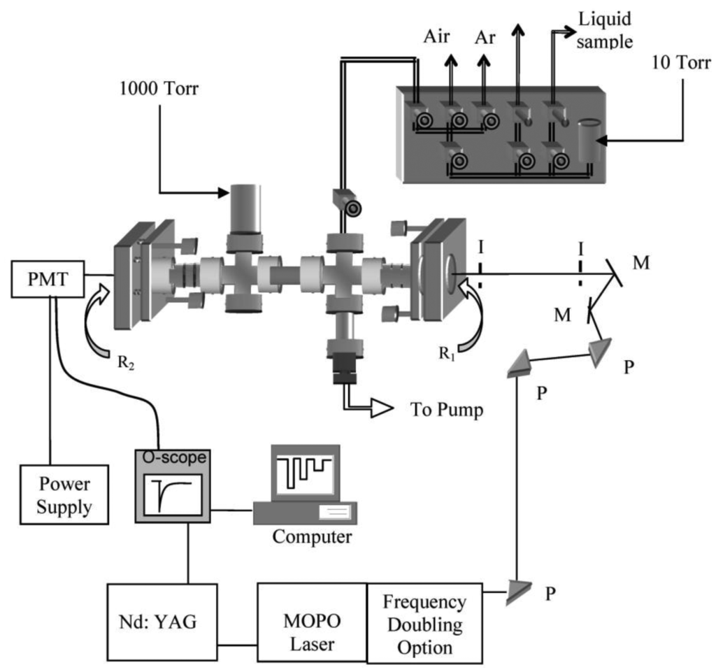 An OPO (SpectraPhysics, MOPO-FDO-HF) pumped by an Nd:YAG (Qaunta Ray Pro-290, SpectraPhysics) was employed to generate the wavelengths in the UV. The 355 nm output of the YAG was injected into the MOPO and subsequently frequency doubled to the UV wavelengths (261–275 nm) examined in this study. The MOPO system was outfitted with the high finesse frequency doubling option to allow 0.001 nm wavelength resolution. The output beam was directed through a series of prisms, beam steering optics, and irises prior to entering the ringdown cavity to ensure wavelength separation due to collinear visible output and stray 355 nm transmissions. The signal exiting the ringdown cavity was detected by a PMT (Hamamatsu, R928) placed behind the second ringdown mirror. A Tektronix TDS 410A oscilloscope, interfaced to a PC, captured each ringdown event. An in-house fabricated ringdown program determined the ringdown time corresponding to each ringdown waveform provided by the oscilloscope. Upon completion of the preliminary data acquisition, a UV pulsed wavemeter (Burleigh/EXFO, WA-5500) was incorporated to verify the output wavelength of the MOPO system.