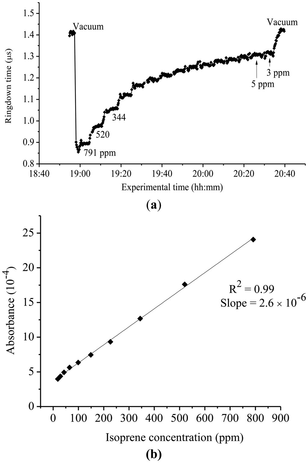 Absorption measurements of each sample were made at atmospheric pressure by introducing a known quantity (generally a few Torr) of the sample into the vacuum chamber and then bringing the total pressure to the atmospheric pressure with ultra-high purity argon (>99.99%, Airgas). Isoprene in N2 (1% by weight (99.99% purity)) and acetone in N2 (0.8% by weight (99.99% purity)) were obtained from Scott Specialty Gases. The vacuum chamber hosted two high reflectivity ringdown mirrors (Los Gatos Research), R = 99.8%, connections for the sample introduction, the pumping mechanism, and multiple pressure transducers. The ringdown mirrors were mounted in the ends of the stainless steel vacuum chamber in Gimbal mounts, which were connected to the chamber via flexible bellows, and spaced 74 cm apart. A rotary pump was employed to evacuate the chamber between samples and aid in sample dilutions. A 10 Torr MKS pressure transducer was utilized to accurately and reproducibly introduce measurable amounts of gaseous samples into the ringdown cavity, and a second gauge (1,000 Torr, MKS) allowed the chamber to be taken to atmospheric pressure with argon. Sequential dilutions were performed by partially evacuating the ringdown chamber with the rotary pump and filling the chamber to atmospheric pressure (set at 760 Torr) with the argon. At each dilution, the corresponding ringdown time was obtained. This procedure was implemented for all isoprene and acetone data in this study. To eliminate any measurement deviation due to temperature effects, the room temperature was maintained at 296 ± 2 K throughout the experiment. The ringdown time recorded at vacuum was approximately 1.40 μs. The stability of the signals is measured by the baseline stability, which is defined as , where στ is the standard deviation of the ringdown signals and τ̅ is the average ringdown time. Typically, the baseline stability for the vacuum chamber throughout the experiments remained to be ≤0.5%.