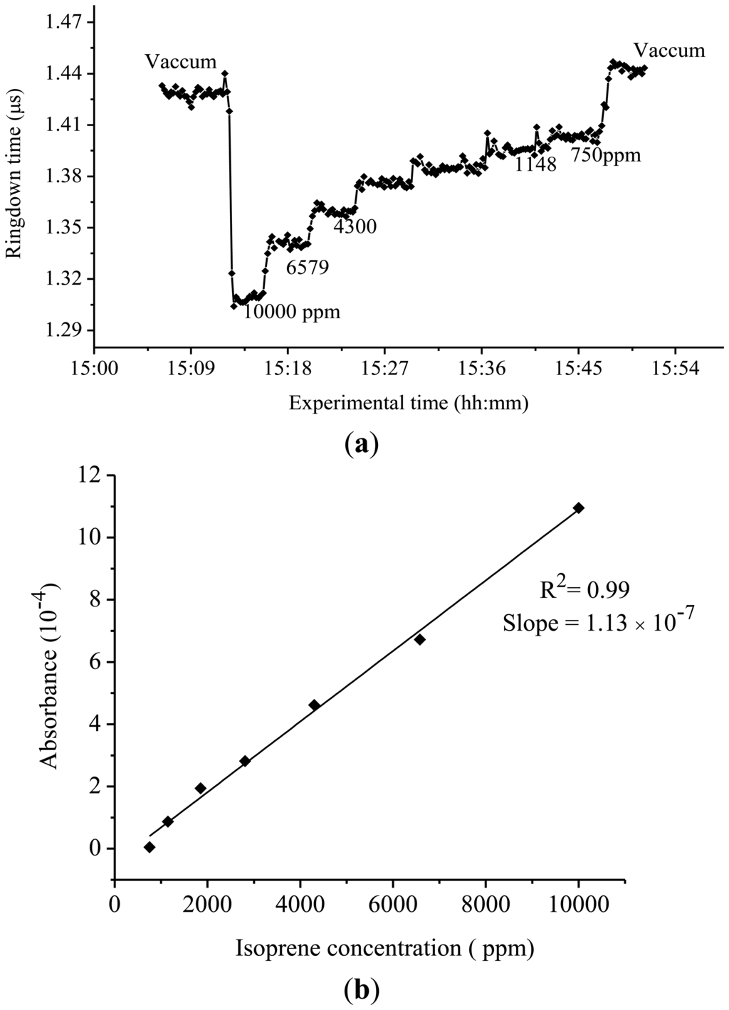 The results of the ringdown measurements of isoprene conducted at 275 nm are shown in Figure 4. Owing to the very low absorption strength in this region (confirmed later by the results of this experiment), a concentration of isoprene gas samples up to a few thousands of ppm was required in order to observe a significant change in the ringdown time. For example, at the 275 nm wavelength, when 10,000 ppm isoprene gas sample was introduced into the chamber, the ringdown time dropped to 1.30 μs from 1.42 μs in the vacuumed chamber, as shown in the Figure 4(a). Subsequently, the ringdown time increased only up to 1.33 μs even when the isoprene concentration in the chamber was decreased to 6,579 ppm. The difference in the ringdown times narrowed down further with decrease in the isoprene concentration. At 1,148 and 750 ppm, the difference in the ringdown time was only 0.01 μs; the actual ringdown times recorded at these concentrations were 1.39 μs and 1.40 μs, respectively. Figure 4(b) shows the experimental curve of the measured isoprene absorbance at 275 nm versus isoprene concentration. A good linearity, R2 = 0.99, was obtained. Based on the slope of the curve, the absorption cross-section of isoprene at 275 nm was measured to be 6.20 × 10−23 cm2·molecule−1. Similarly, absorption cross-section of isoprene at 270 nm was also determined, which was 4.81 × 10−22 cm2·molecule−1.