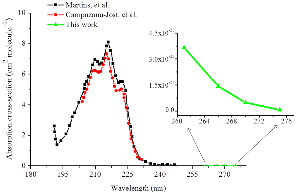 Table 1 lists the absorption cross-sections of isoprene measured in the wavelength range 261–275 nm in this work and those reported in the literature in the wavelength range 261–269 nm. The cross-sections measured at 261 and 266 nm are in accordance with those reported in the literature, while the cross-sections at 270 and 275 nm are the new measurements.