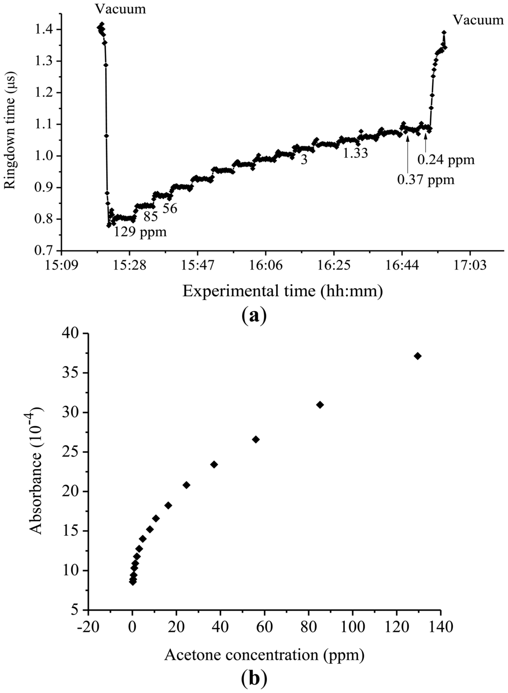 From various experimental results obtained in the present work, the ringdown absorption data were taken in the concentration range of 3-5 ppm for isoprene, in the range of 0.24-1.33 ppm for acetone, and at 760 Torr for 5% CO2 in argon gas by volume. Their ringdown absorption results are presented in Figure 7. The ringdown times with the vacuum cavity or the cavity filled with 760 Torr Ar were consistently at 1.40 and 1.32 μs, respectively. The decrease in the ringdown time upon introducing 760 Torr Ar into the chamber is attributed to the scattering losses of the light by Ar atoms, as the absorption strength of Ar at 266 nm is negligible. In either case, the ringdown signal stability remained the same, 0.5%. In the subsequent text, the ringdown time obtained in the vacuum, i.e., 1.40 μs, will be termed as “the vacuum baseline”, and similarly “the Ar baseline” means the ringdown time of 1.32 μs when the chamber was filled with pure argon gas to 760 Torr.