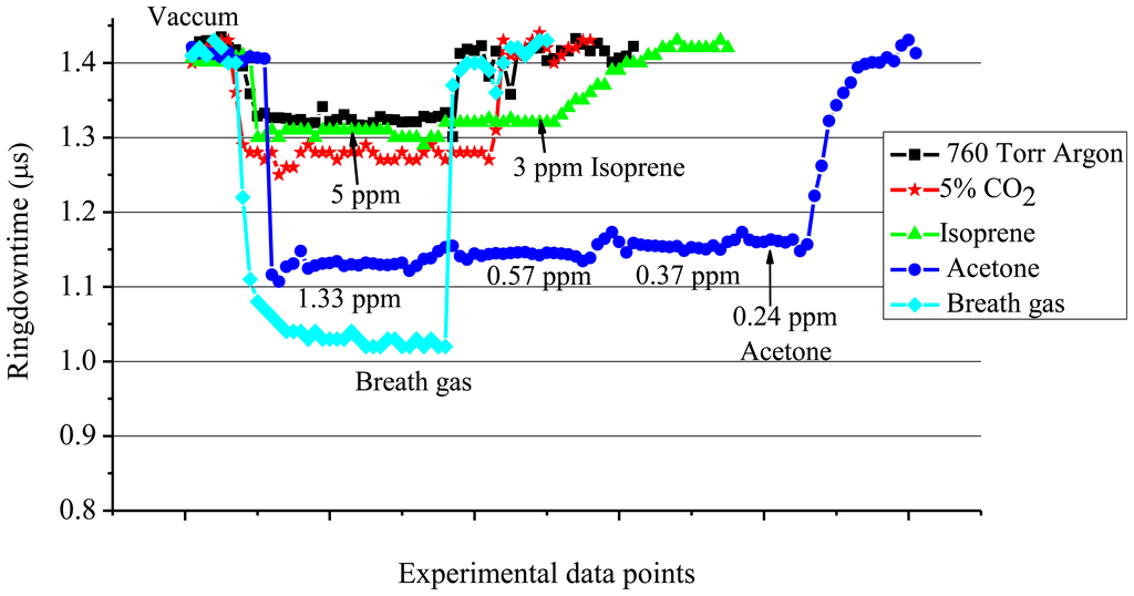 In the final part of this study, the results were compared with actual breath gas. Breath gas from a healthy human subject was collected in a Tedlar bag and injected into the chamber. Subsequently, the ringdown times were recorded. As depicted in Figure 7, upon injecting the breath gas inside the chamber, the vacuum baseline (1.40 μs) dropped to 1.02 μs. Ringdown times were recorded continuously for a few minutes while the stability of the signal remained at 0.5%. In this particular experiment, the drop in the ringdown signal when the breath gas was injected inside the chamber was slightly larger than the drop in the ringdown signal when a 1.33 ppm acetone gas was measured. The acetone concentration in healthy human exhaled breath varies from 0.1-2.7 ppm [5,14,49,50], while isoprene has been reported to be in the range of few hundreds of ppb [14-18,43,50,51]; therefore, this result implies that there is a possibility of the contributions from other VOCs present in the exhaled breath. In general, most of the VOCs in breath gas are present in very low concentration as compared to acetone, isoprene, and CO2 (CO2 is about 5% in normal human breath gas). In addition, most of the VOCs in breath gas do not have strong absorption at 266 nm. Therefore, other than acetone, no single VOC present in the breath gas alone can cause such a large difference in the ringdown time. However, a number of VOCs in terms of absorption as well as scattering do have an ineligible amount of collective contribution to the change in ringdown signals, which needs to be considered in the development of a data processing algorithm when breath gas is measured at 266 nm.