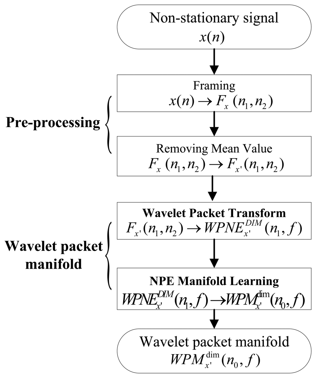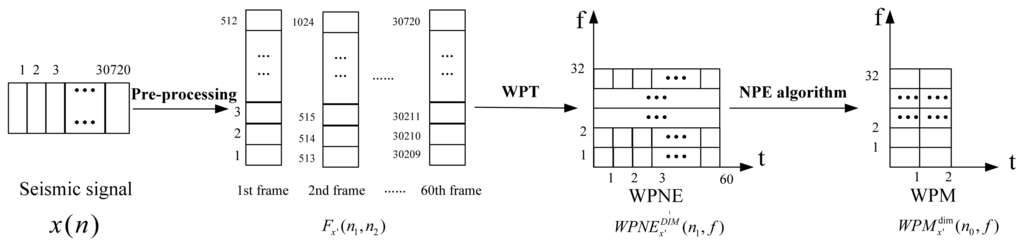 It is known that wavelet packet transforms (WPT) are commonly used to reveal the non-stationary characteristics of a seismic target [3,12]. In addition, the NPE algorithm of manifold learning can reveal the low-dimensional structure hidden in high-dimensional data [23]. Therefore, this paper intends to construct a robust feature which is non-stationary and low-dimensional, called WPM, by applying the NPE algorithm to WPNE. To achieve this aim, two techniques comprising WPT and the NPE algorithm of manifold learning are integrated, as indicated in Figure 1. Given an analyzed signal x(n), the WPM principles are described in the following subsections.