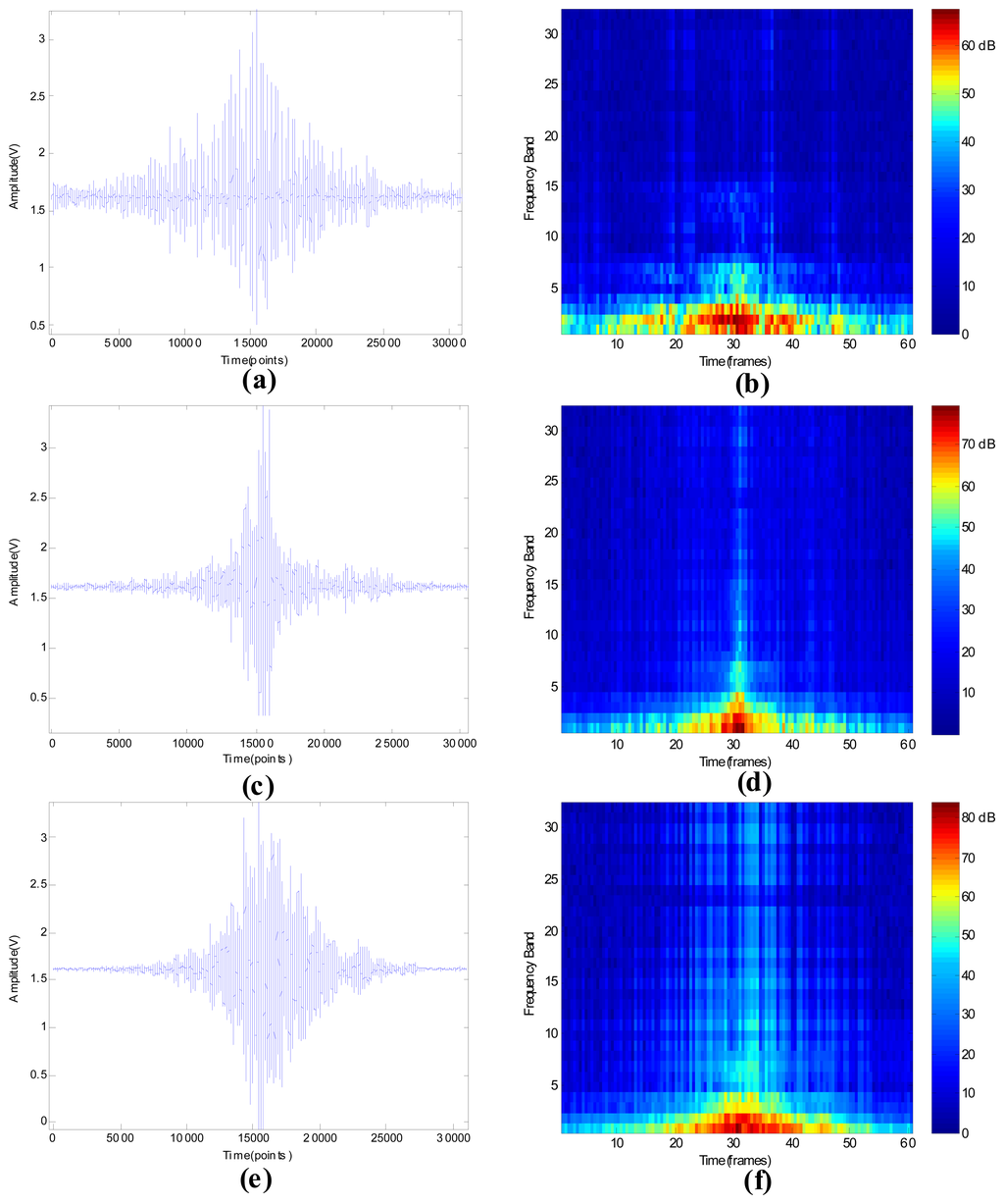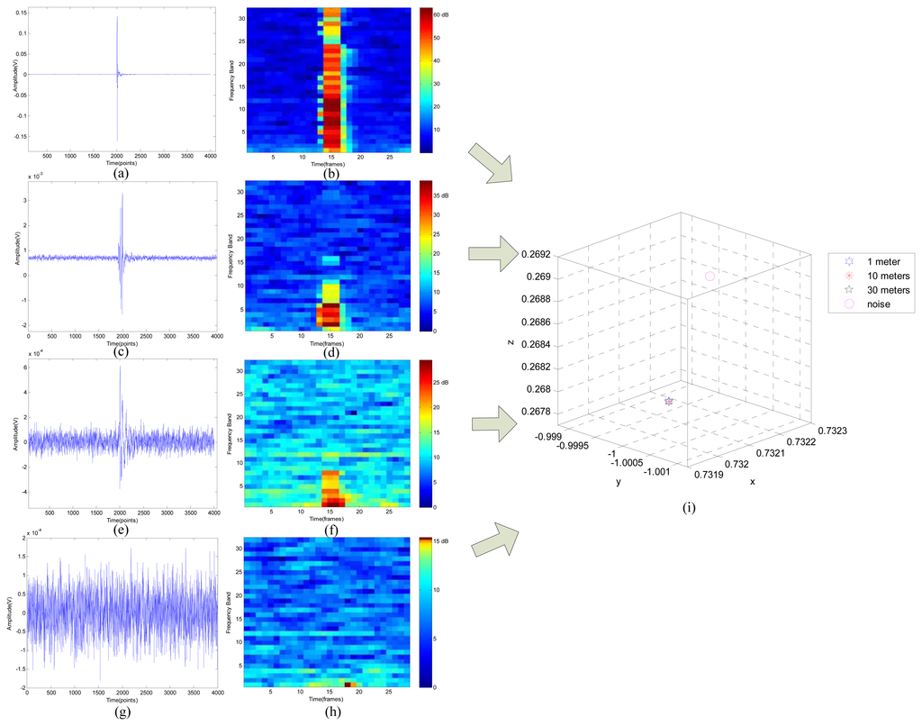As shown in Figure 4(a,c,e), sharp impulses can only be observed when the shot is hitting the ground, because the sampled seismic signal is induced by background noise when a bump doesn't happen. Examination of Figure 4(a,c,e) shows the gradual degradation of the impulses as the propagation distance increases from 1 meter to 30 meters and the transition of impulses from sharpness to flatness, which means the signal-noise-ratio (SNR) decreases heavily as the propagation distance increases, because the farther signal propagates, the worse the signal degrades. As displayed in Figure 4(a,b), in the moment that impulses occur, the WPNE is obvious different from other times'. According to Figure 4(b,d,f), the WPNEs of impulses become more and more indistinct as the propagation distance increases. Seismic signals are generated in three different positions with different signal-noise-ratios and with different underlying geology conditions, while their signatures, including the waveform in time-domain and WPNEs in time-frequency domain, change considerably when the position of the target varies. In order to combine the non-stationary information and low-dimensional information, the NPE algorithm is applied on WPNE to construct WPM and the dimensionality of WPM is reduced to 3 × 1 (the dimensionality of WPM is first reduced to 32 × 1, subsequently it is reduced to 3 × 1) to clearly display the results as described in Figure 4(i). Fortunately, regardless of the differences of geology condition and environmental noise, the WPMs of the signals generated at the three positions gather at one point, what's more, they are different from noises.