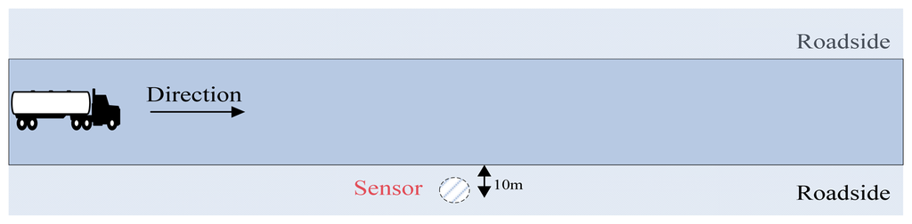 The underlying geology condition of the experimental field isn't very homogenous, since the field is transformed from a building wasteland and lots of building rubbish remains underground. A seismic sensor is vertically buried 10 centimeters into the ground where 10 meters away from the road. The category of the employed seismic sensor is as discussed in Section 3.2. The experimental situation is shown in Figure 5. In this paper, four categories of seismic targets, including pedestrians, tracked vehicles, wheeled vehicles and helicopters, are involved in our classification, and part of their specifications are listed in Table 2. When the experiment is conducted, the targets move on at a constant velocity, while different targets have different velocities, just as Table 3 shows. Specifically, the helicopter flies at the height of 300 meters above the road and the reason why a helicopter can induce the ground seismic signal can be seen in [2].