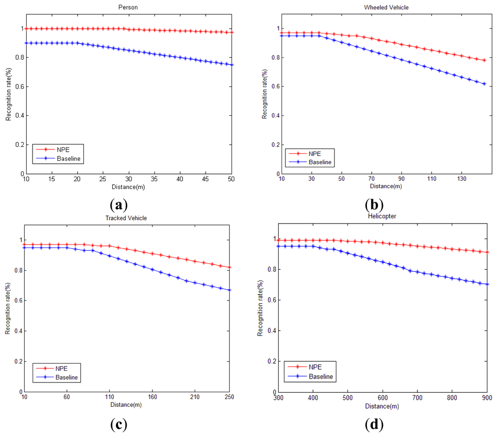 Real-time classification results vary with environment, as shown in Figure 7. The horizontal axis of Figure 7 represents the target position which is denoted by the slant distance between the target and sensor. Naturally, different positions have different signal-noise ratios and different underlying geology conditions. The baseline curve displays the classification results of a method that directly uses WPNE with size of 32 × 60. The NPE curve represents the target recognition rate using WPM whose parameters are as shown in Table 4. In Figure 7, all recognition rates will go down when the distance increases. Fortunately, the NPE curve decreases more slowly than the baseline one. Experimental results denote that the WPM feature is more robust and suitable for moving target classification. Table 5 details the average result of Figure 7. As to the recognition of the four targets, the average classification rate of the NPE approach is 11.53% higher than baseline.