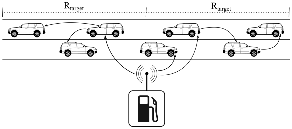 Gas stations advertise their location and other data periodically. The spread message contains the gas station location and a target zone. The location could be manually configured by the manager if it cannot be obtained automatically by a GPS device. The target zone is determined by a radius of interest, Rtarget. This and the time interval between announcements are both configurable. The manager of the gas station is supposed to have a PC or mobile application that lets her adjust the settings and transfer them to the RSU.