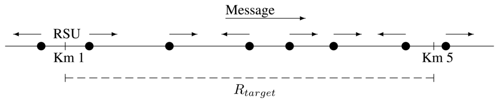 Let us assume that the vehicle density is enough, so that there is not any disconnection in the distance, Rtarget, of interest. We say that the number of receivers in such a distance is ρ × Rtarget, where ρ is the traffic density in the road segment in vehicles per space unit.