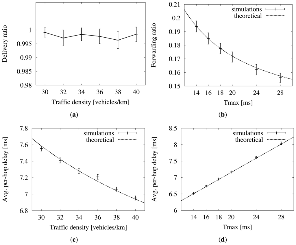 In Figure 11b–d, we have drawn dotted lines to represent the theoretical forwarding ratio and average per-hop delay. The forwarding ratio is calculated with Equation (4). The average per-hop delay is easily obtained from Equation (1) by replacing the minimum distance with E[dmax] and adding the fixed previous wait, W. We confirm that the values resulting from the simulations, drawn with error bars, tally with the analytical model. This proves that the suggested default value of Tmax = 18 ms, deduced from the mentioned equations, is appropriate for a moving scenario, too. The reason for this is that messages travel much faster than vehicles. Even if the relay had had to wait the maximum per-hop time (i.e., 18 + 5 = 23 ms), the vehicle would have moved less than a meter from the reception of the packet to the time of forwarding it. Though in movement, the scenario is almost static from the point of view of communications speeds.