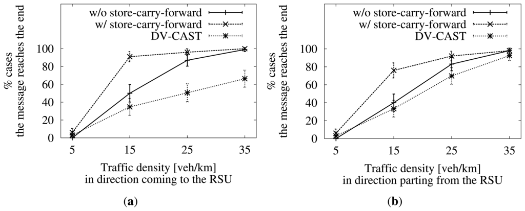 The first thing we can notice is that the addition of the store-carry-forward mechanism described here improves the results for cases of not full connectivity (less than 35 vehicles/km). Furthermore, despite its use, the results are still poor when the traffic density on both sides of the road is very low. Both aspects could be expected.