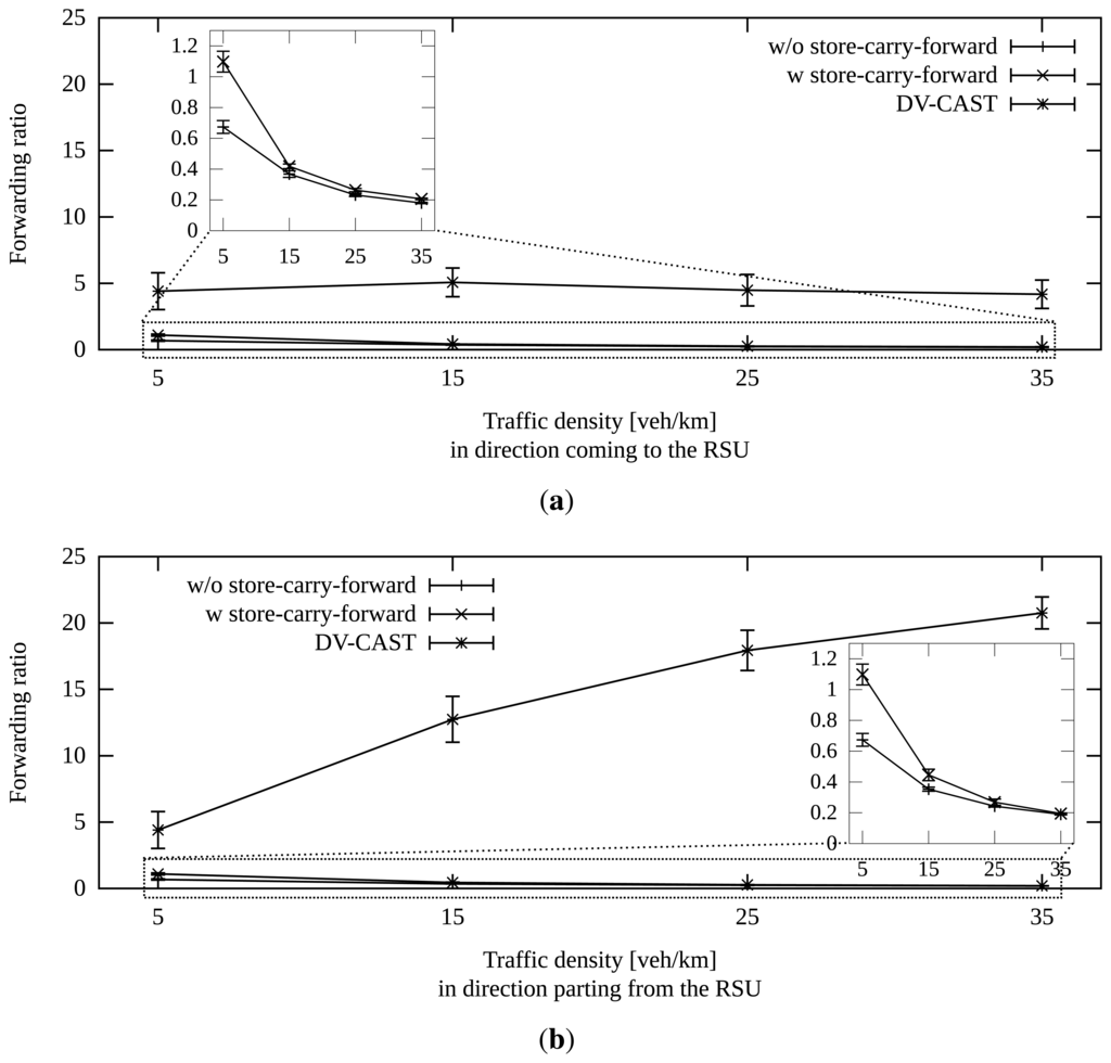 The general improvement in the success rate that provides store-carry-forward comes at the price of a higher number of messages. In Figure 13a,b, we can see the ratio of the number of duplicates per number of vehicles that heard the message. In the cases of extremely low density, this ratio is even greater than one. However, this is not a problem, because the total number of messages is still low.