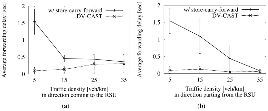 Finally, we see the average delay before forwarding at each hop in Figure 14a,b. Each vehicle has to decide whether to forward an incoming packet or not. In our proposal, this decision is based on the use of several timers, which add a delay. As the density gets higher, the probability of a vehicle ending the wait sooner gets higher, too. DV-CAST has a simpler approach, where a timer is needed only in the case of a well-connected scenario. Because of the reasoning above, the wait is short in DV-CAST, too. Thanks to this, the experienced delay is much lower than in our approach in sparse scenarios.
