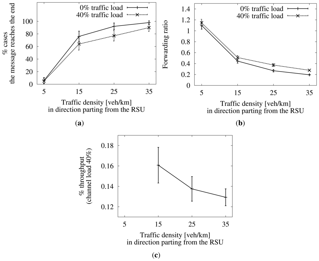 The configuration is the same as in Section 7.3.1, but now, we add a channel load of 40% for a normal communications situation [16], as stated in Table 8. This channel load is assumed to be due to any type of communication that is already being carried out by all the vehicles in the scenario. We want to prove the performance of the proposed solution in a realistic scenario. Again, we have kept the traffic density in the direction coming to the RSU fixed at five vehicles/km, while varying the other direction's.