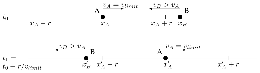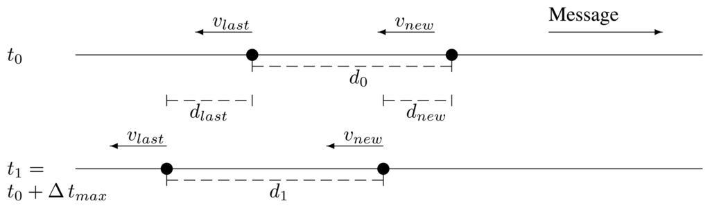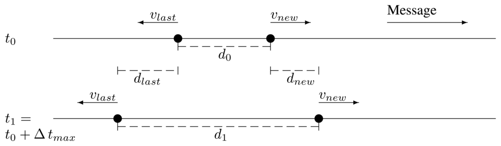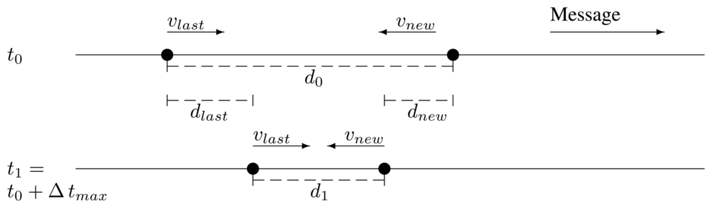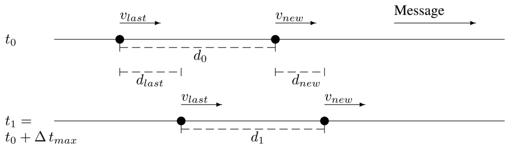 The last relay and the potential new one are traveling in the same direction and in the same direction as the message, too. Their respective current speeds are vlast and vnew. In the moment of forwarding, t0, they are apart a distance, d0. After the maximum time it may take a retransmission by the new one to reach the last one, Δ tmax, the last relay has traveled a distance, dlast, and the potential new relay, a distance dnew. They are apart a distance, d1, depicted in Figure 3: