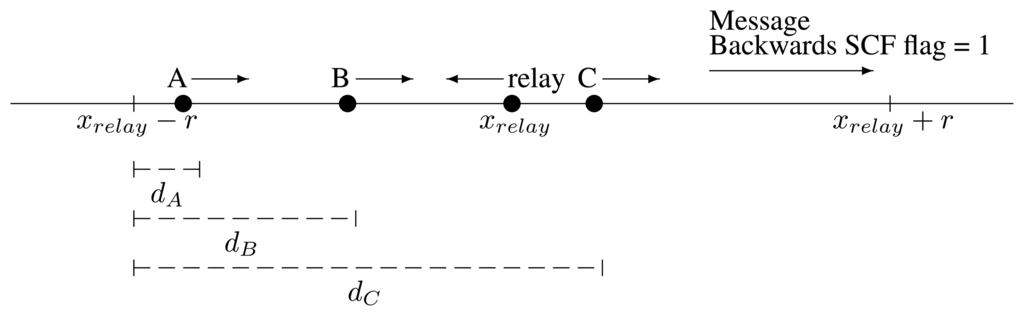 When a vehicle hears a message with the backwards flag set to one, it knows it is a special situation. The message cannot travel in the intended direction. In such a case, any vehicle traveling in the same direction as the message must help. It will act as if the message was new, even if it is not. In such a case, this vehicle and other potential “rescuers” can be in any point of the range, ±r, from the relay location, xrelay, as depicted in Figure 7. Therefore, instead of using Equation (1), the “rescuers” will use a variation.