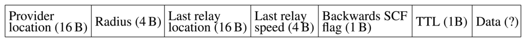 Along with the specific information (brand name, prices, etc.) that the service provider wants to spread, the station location and the target zone must be specified in the message. The provider location is unique and fixed, so it is used to detecting duplicates. The (configurable) target zone is determined by simply indicating a radius of interest. It is also necessary to replace the location and the speed of the last forwarder at every hop, so that we can make use of our distance-based flooding scheme and the store-carry-forward mechanism. A “backwards SCF” flag is also necessary, so that vehicles traveling in the opposite direction as the message can signal when they are doing store-carry-forward. Finally, a TTL field is used to determine the occurrence of simultaneous duplicates by all the involved vehicles.