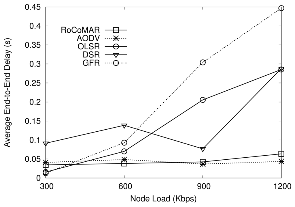 Figure 10 compares the average end-to-end delay of RoCoMAR with other protocols. As shown in the Figure 10, RoCoMAR and AODV show a consistently low average end-to-end delay (less than 0.5 seconds) over the network loads. This indicates that RoCoMAR can be applied effectively without a large delay in a mobile sensor network where the high data rate applications are used. As also shown in Figure 10, the delay of GFR, DSR, and OLSR sharply increase as the network loads grow. In particular, the delay of DSR is fluctuating due to the unpredictable nature of DSR routing cache.