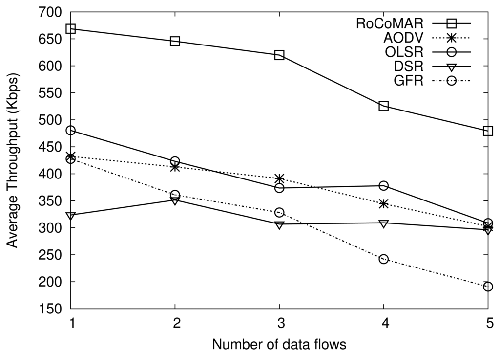 As shown Figure 11, RoCoMAR also achieves a higher throughput than other routing protocols. For example, when the number of data flows is 2, RoCoMAR has throughput higher than 650 Kbps, while other protocols show less than 450 Kbps. As shown in Figure 11, the gap between throughput values of RoCoMAR and other protocols tend to decrease as the number of data flows grows. It is because there are only 5 RNs in the network, which implies that the ratio of the number of RNs per a route decreases from 5 to 2.5, 1.7, 1.25 and 1. As a result, it is possible that the poorest link is selected to be reinforced but the available RNs could not be found.