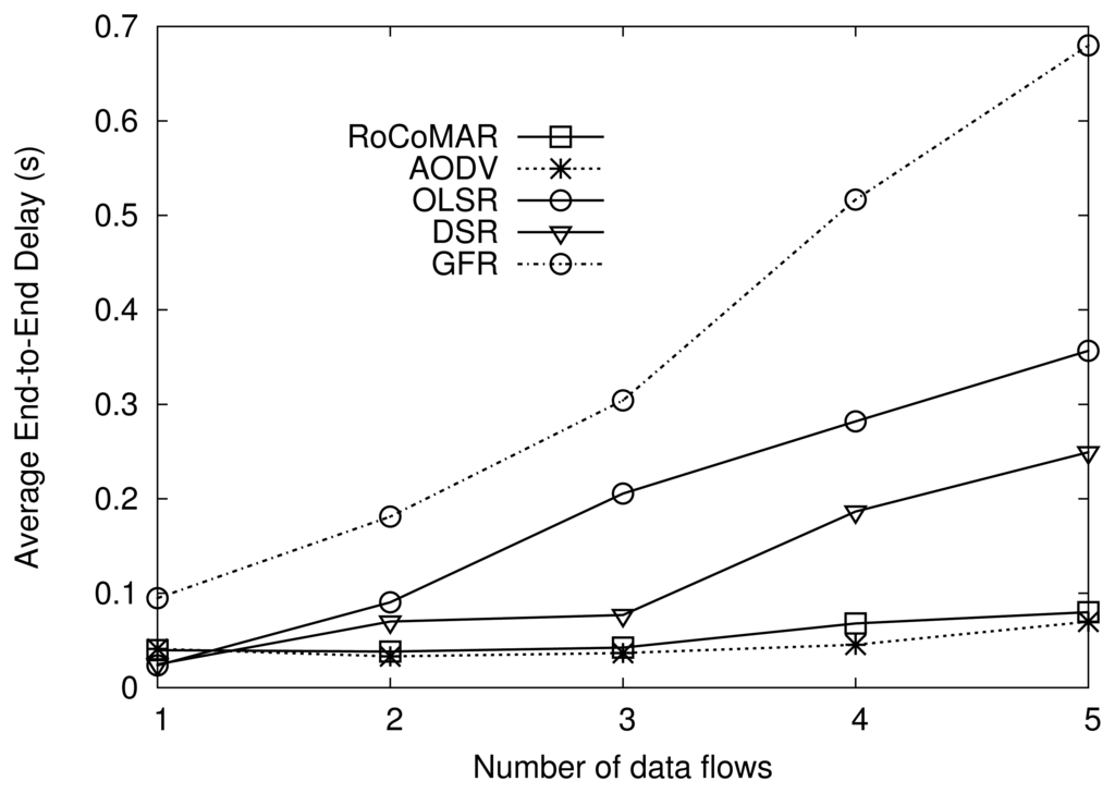 Figure 12 shows the average end-to-end delay of protocols. As seen in Figure 12, RoCoMAR also shows the consistently low average end-to-end delay, while the delay of DSR, OLSR, and GFR becomes long as the number of data flow increases. The reason of low performance of those routing protocols is as following: the frequency of route discovery of those routing protocols is high because the quality of links varies unpredictably over time and space due to the fading channel and network topology changes. As a result, data delivery delay as well as the routing overhead are increased.