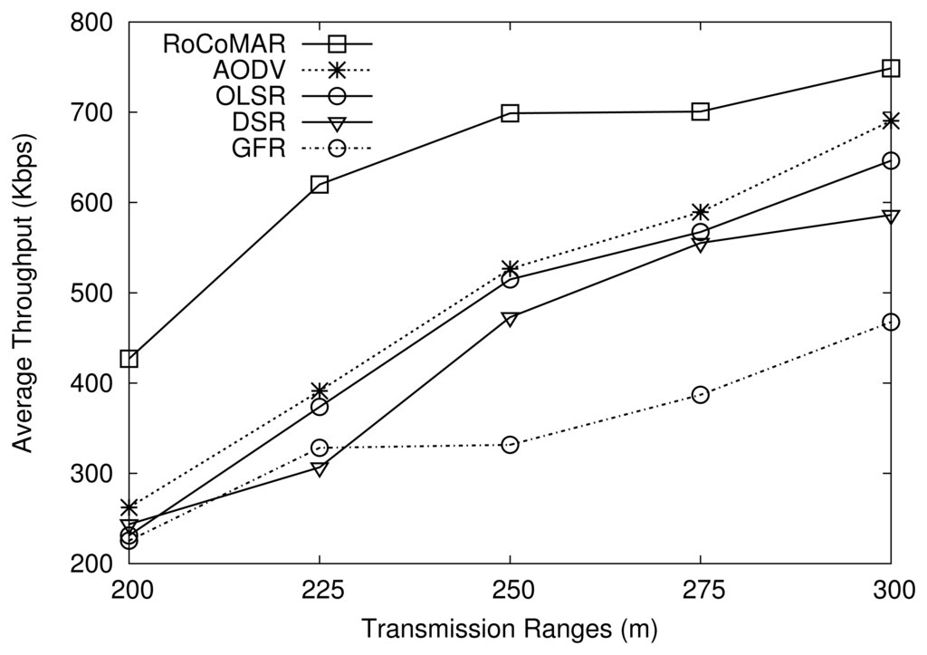 Figure 13 shows the average throughput of routing protocols over different transmission ranges of nodes. As shown in Figure 13, the average throughput of all routing protocols increases as the transmission range of nodes grows. The reason is that, given the same distance between two communicating peers, a longer transmission distance leads to a good link quality due to a higher RSSI and SNR. Also, with a longer transmission distance, the possibility of link breakage becomes lower. The results in Figure 13 also indicate that RoCoMAR achieves the highest throughput among routing protocols over different transmission ranges. Moreover, RoCoMAR's throughput gain tends to decrease as the transmission range of nodes grows, since nodes can find a good quality link without link reinforcement i.e., the quality of links in the network becomes higher as the transmission range of nodes increases.