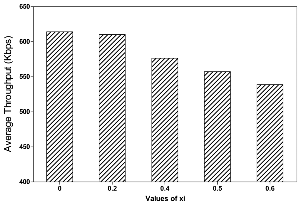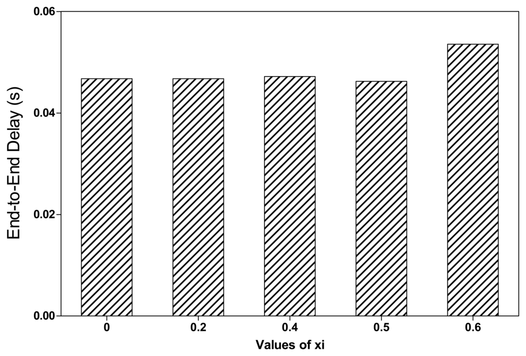 As shown in Figure 15, the average throughput of RoCoMAR decreases as the value of ξ grows. This is because a larger value of ξ results in a low possibility of placing a new relay node even some degree of performance gain is expected. Figure 16 shows the average end-to-end delay of RoCoMAR over different values of ξ. As shown in Figure 16, the delay of RoCoMAR mostly keeps stable as the value of ξ varies. The these results indicate the variation of ξ does not have a significant effect on the end-to-end delay of RoCoMAR.