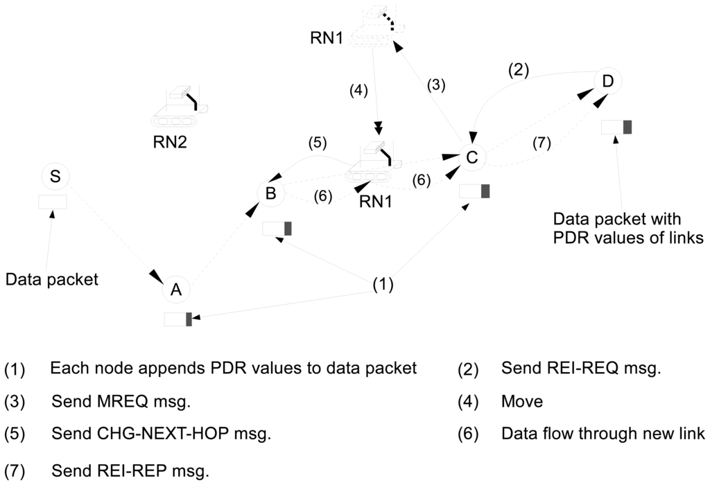 Figure 2 illustrates an example of the reinforcement process. As shown in the example of Figure 2, each node on the path (e.g., A, B and C) appends the PDR value of its link to the data packet header (1). When node D receives the data packet which consists of the PDR values of links, it calculates Rete. Assume that Rete is less than Rreq, and the link between B and C is the link with the lowest quality on the path. Then node D sends a REI-REQ to node C to request for a new relay node (2). When node C receives REI-REQ (2), it becomes a REI node and selects RN1 as a new relay and sends MREQ to RN1 (3). Upon receiving MREQ, the RN1 moves to the midpoint position of the link between node B and node C (4). When the RN1 arrives at position of the midpoint of link between node B and node C, it sends the CHG-NEXT-HOP message to node B (5) and adds itself to the route from node S to node D. Node B updates its routing table and starts forwarding the data packets to RN1 (6). When node C receives the first data packet from RN1 (6), it sends a REI-REP that indicates that a new relay node is successfully added (7).