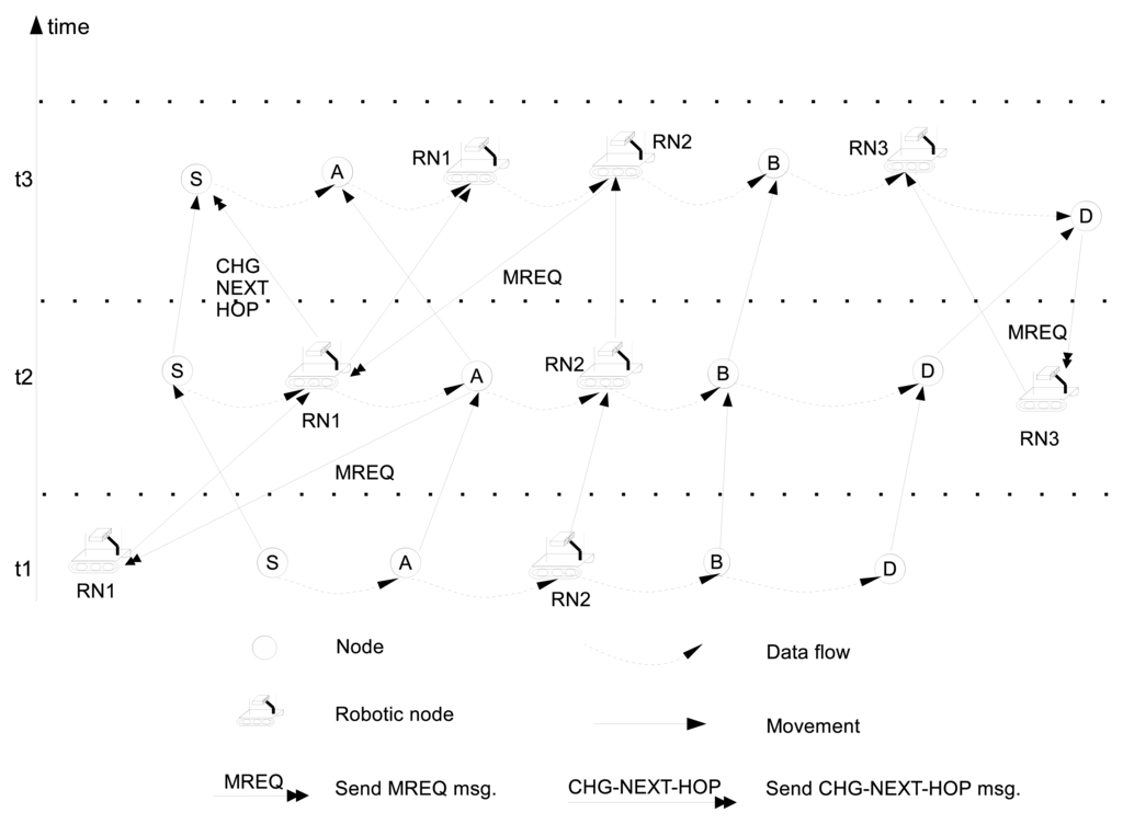 Then, node D compares the current value of Rete with a required PDR value, Rreq, which is specified by the user application. If the current end-to-end PDR value of the route is less than Rreq, the node D determines the link that has the lowest PDR value (or the poorest link). Then, node D sends a reinforcement request (REI-REQ) message to the data-receiving node of the poorest link, which is referred to as REI (reinforcement) node hereafter. Upon the reception of REI-REQ message, the REI node sends an ACK message to confirm the reception. If node D does not receive the ACK after k time retransmissions of REI-REQ message, it selects another link to reinforce. If the node D receives the ACK message to the REI-REQ message, it waits for reinforcement reply (REI-REP) message, which indicates whether or not the placement of new robotic relay has been successfully performed.