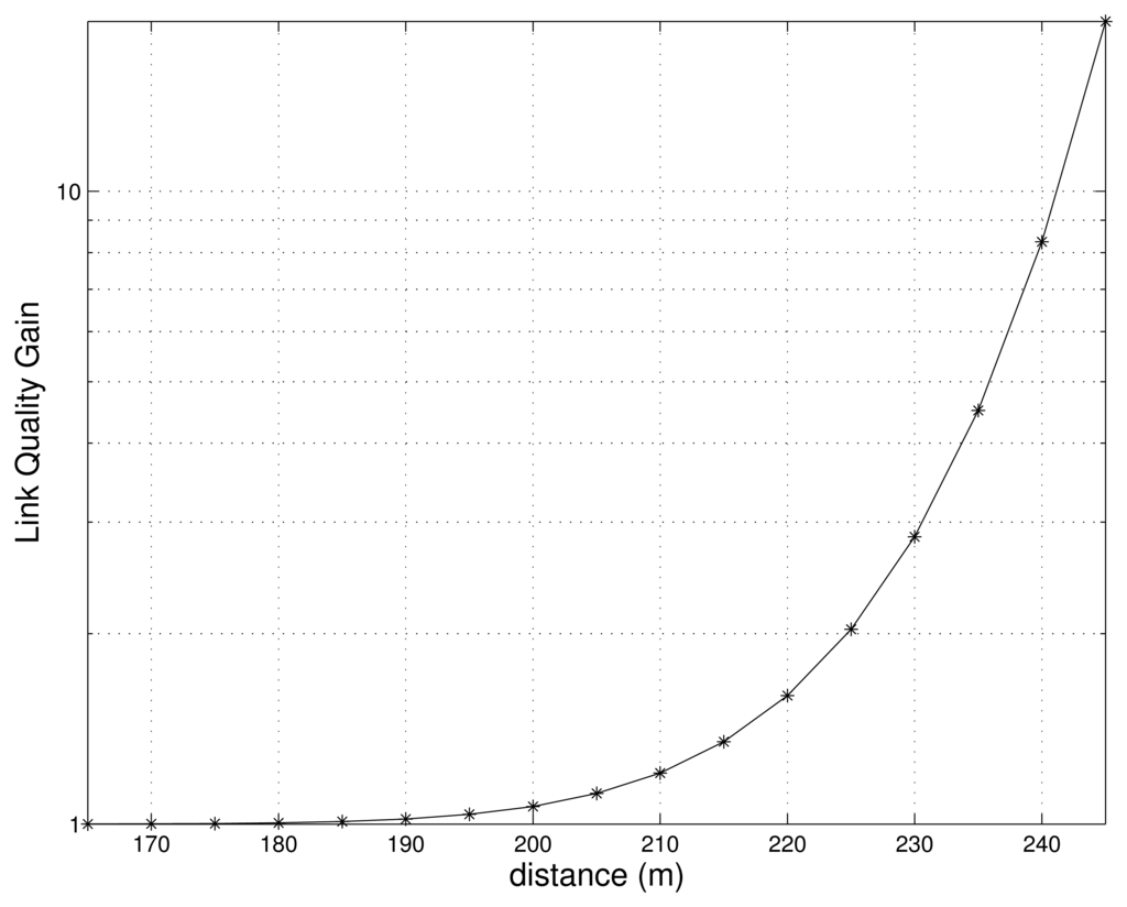 From Equations (8) and (9), the end-to-end link quality gain, Gq, for the route due to the adding number of relay nodes of l, can be obtained. That is