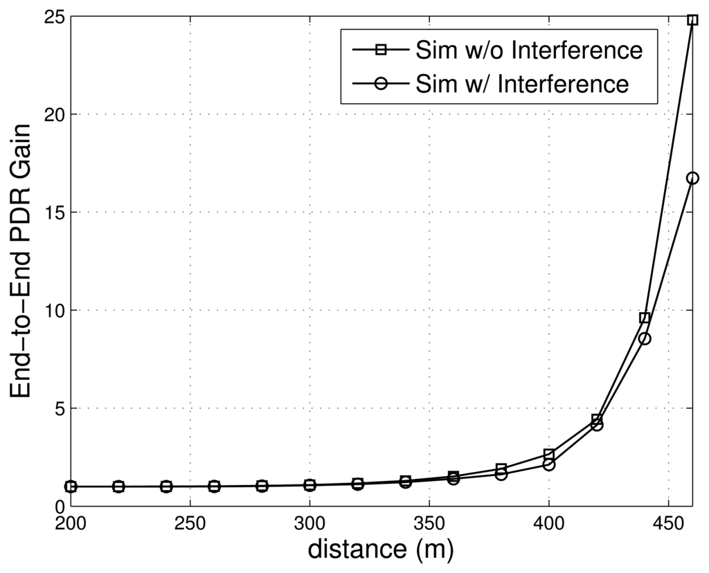 Figure 6 shows the end-to-end PDR gains as the distance between source and destination nodes varies. As shown in Figure 6, the gain increases as the distance grows. In particular, the gain sharply grows when the distance becomes longer then 350m. The results in Figure 6 also indicate that the gain without interference is higher than that with interference.