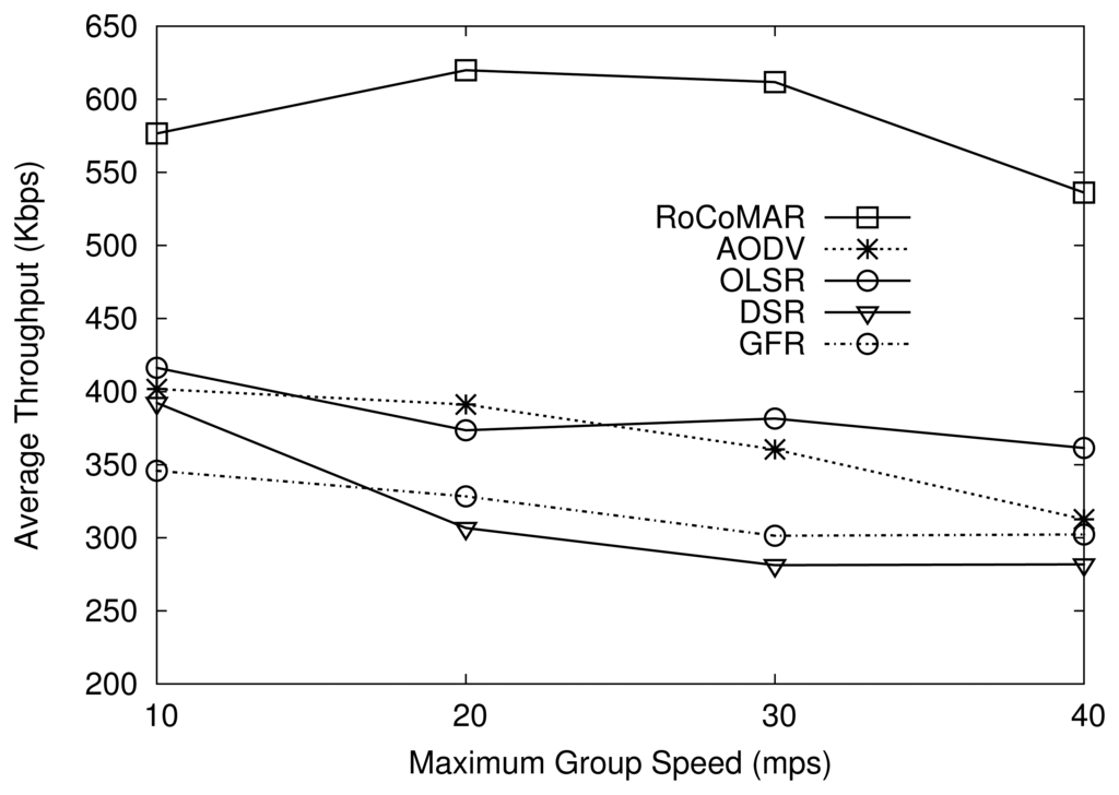 As shown in Figure 7, RoCoMAR shows a higher throughput than AODV, OLSR, DSR and GFR. For example, when the maximum speed of the group is 20 m/s, RoCoMAR's throughput is higher than 600 Kbps, while other protocols show less than 400 Kbps. Also, over the variation of the maximum group speed, RoCoMAR consistently shows a higher throughput than other protocols. It is because RoCoMAR not only effectively reinforces the low quality links but also prevents wireless link breakage that causes a high loss rate of data packets and frequent route discovery processes. Also note that RoCoMAR enables RNs to keep the network connectivity between nodes in a group and the sink even when the group of nodes moves far away from the sink.