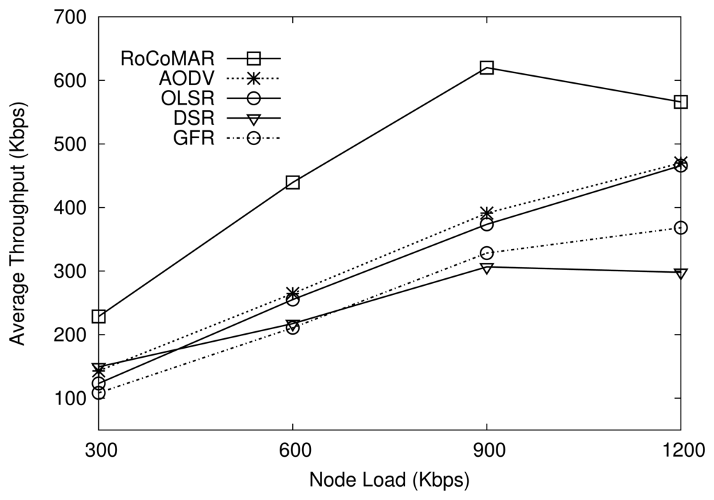 As we can see in Figure 9, RoCoMAR achieves the highest throughput compared with others over various network loads. For example, when the load of each node is 900 Kbps, RoCoMAR has the average throughput over 600 Kbps, while other protocols show less than 400 Kbps. As also shown in Figure 9, RoCoMAR's throughput increases until the node load becomes 900Kbps then decreases. The reason is that a significant amount of MAC layer packet collisions and retransmissions occur as the data rate becomes close to the network capacity, which degrades the valid network throughput. DSR shows the lowest throughput when the network load is high.