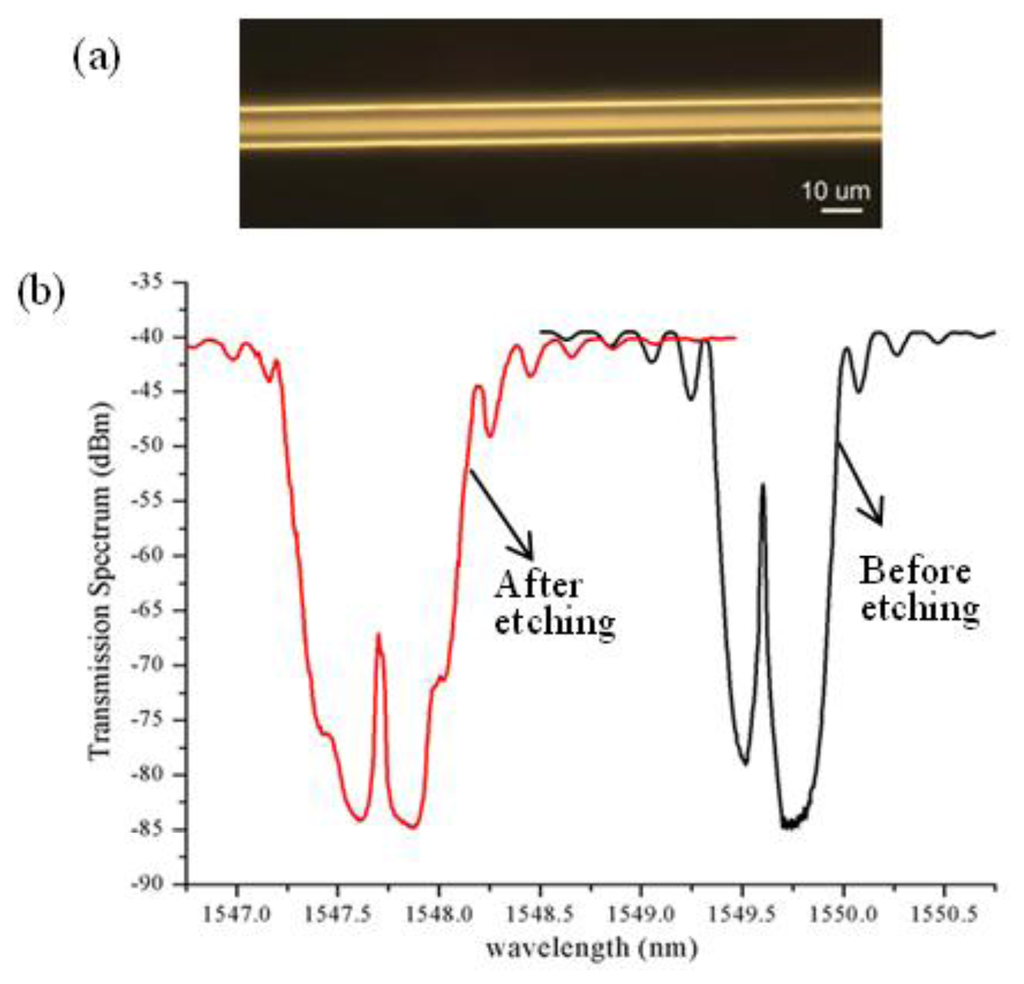 A small diameter (D = 80 μm) single-mode fiber (SMF) was chosen for the sensor fabrication. Compared to a regular 125 μm fiber, the use of the small diameter fiber can significantly improve the fiber etching efficiency that is performed after the πFBG fabrication. To achieve the πFBG RI sensor structure as shown in Figure 1, a 7.6 mm long πFBG was written on the fiber using a setup and procedure reported earlier [12]. It is based on a scanning 193 nm UV laser beam, an aperture, and a uniform phasemask mounted on a high-precision translation stage. Briefly speaking, the fabrication process consists of three steps. First, a 3.8 mm uniform grating was written by scanning the 193 nm UV-beam which was focused onto the fiber through a cylindrical lens. Then, using the high-precision translation stage, the phase mask was moved by approximately half of the grating pitch, corresponding to the π phase shift of the grating, along the fiber axis direction. The last step was to position the aperture to the other half of grating region and write a uniform grating of the same length by scanning the UV beam again. We note that the use of the 193 nm laser allows us to write high-quality gratings directly on standard germanium-doped fibers without photosensitization through the two-photon UV excitation [13]. After the grating writing, the fiber was etched with a 24% buffered hydrofluoric (BHF) solution. During the etching process, a broadband light source and an optical spectrum analyzer (OSA) were used to monitor the transmission spectrum of the grating. At the beginning, due to the temperature increase from the exothermic reaction of the BHF with SiO2, the grating spectrum shifted to longer wavelength. When the fiber was further thinned so that the evanescent field was exposed to the ambient solution, the grating wavelength started to shift rapidly toward shorter wavelength as the waveguide effect on the effective RI of the mode became dominant. Such spectral evolution during the fiber etching was also observed in [14]. Figure 2a is an optical microscope image of the etched fiber, indicating the fiber diameter was approximately 9.3 μm. Figure 2b shows the transmission spectra of the πFBG in air before and after the fiber etching measured by the OSA, showing that the grating wavelength shifted by ∼2 nm toward shorter wavelength after etching. The characteristic transmission peaks at the center of the πFBG spectra are evident. We also noticed that etching process changed the spectral shape; e.g., the spectrum was more symmetric around the center peak after the fiber etching. The depth of the transmission spectra of the etched πFBG is approximately 45 dB, from which a maximum reflectivity of 99.997% is estimated for the πFBG (ignoring the grating loss and the loss due to the mode-field match between the etched and unetched fiber). With such a high grating reflectivity, extremely narrow spectral feature of the πFBG is expected.