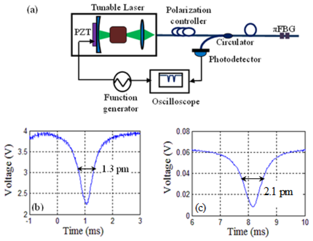 The linewidth of the πFBG reflection spectral notch cannot be measured accurately by the OSA because of the limited resolution (20 pm) of the OSA. Instead, a narrow-linewidth (<300 kHz) external-cavity tunable laser whose wavelength was tuned through a built-in PZT transducer by a triangle voltage wave, was used to measure the reflection spectrum around the πFBG reflection notch, as schematically shown in Figure 3a. The measurement results before and after fiber etching are shown in Figure 3b and 3c respectively. The linewidth of the πFBG spectral notch before fiber etching was ∼1.3 pm, corresponding to a Q = 1.2 × 106. After fiber etching, the spectral notch was noticeably broadened but still had a linewdith of only 2.1 pm (Q = 7.4 × 105), which was more than 10 times narrower than the spectral feature of the FFPI sensor reported in [4].