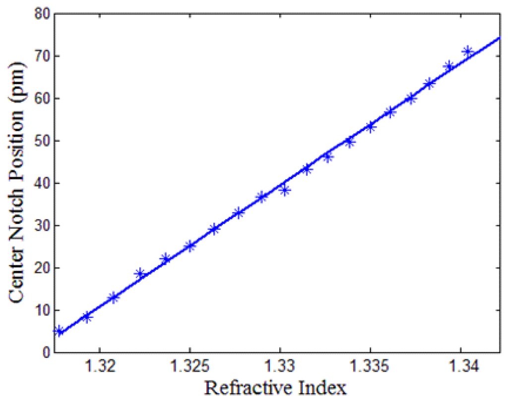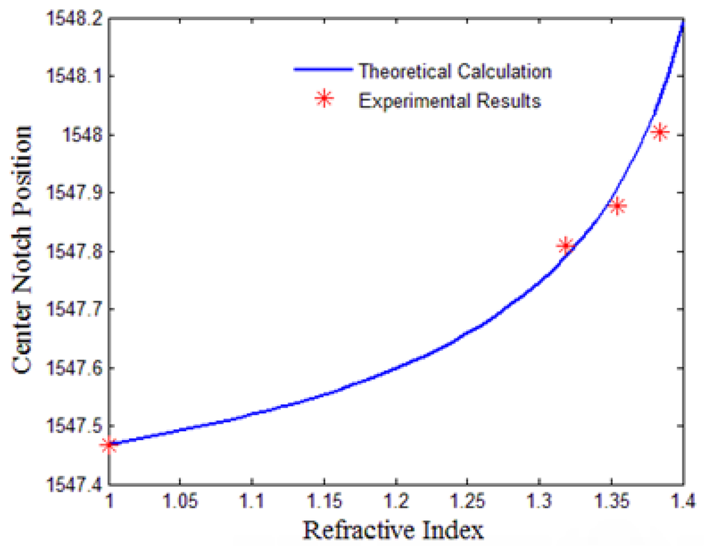 We firstly tested the sensor response to large RI changes. The πFBG sensor was placed in air and liquids of different RIs (water, ethanol, and 40 w.t.% glycerol solution in water) and we measured the πFBG transmission spectrum using a broadband source and an OSA (the same setup in obtaining Figure 2b. Theoretical analysis was also carried out with the following πFBG parameters: fiber core diameter: 9.78 μm; fiber core RI: 1.451; and grating pitch: 535 nm. More specifically, the surrounding environment was considered as the cladding of the fiber and the effective refractive index of the fundamental mode was calculated against the refractive index of the cladding based on a two4ayer optical fiber model, from which the wavelength position of the πFBG center notch was obtained by Equation (1). The experimental results and the simulated curve for the wavelength of the πFBG transmission peak as a function of the RI to be measured are shown in Figure 4 and they agree with each other well.
