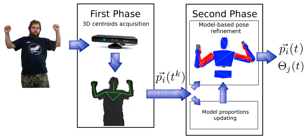 In this paper, a system is proposed that addresses this issue using a kinematics model of a human to enforce and guarantee the validity of obtained poses. In doing so, it tracks human motion in two steps, as depicted in Figure 1. The first step collects 3D centroids of different body parts using the OpenNI HMC algorithm; the second step uses a model-based filter to estimate a valid human pose from these intermediate data. Collected input data are also used to adapt the used model to the particular characteristics of the human being tracked. Both procedures (pose checking and adaptation) are executed in parallel (Figure 1) and do not reduce the frame rate of the original HMC system provided by OpenNI framework.