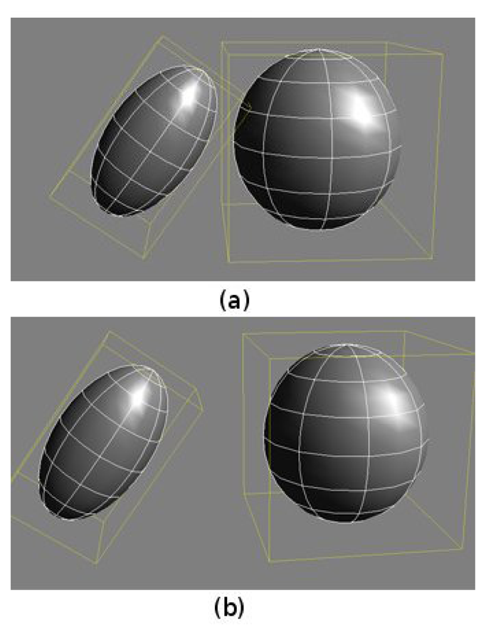 Self-collision avoidance algorithms. The method used in this paper follows an efficient two-step collision detection process, which can be considered a simple example of a multiresolution static collision detection algorithm []. In this case, only two levels of detail are used: bounding box level and detailed mesh level. Thus, the method executes a first collision detection process at the bounding box level and a second detection process at the mesh level, only if bounding boxes are colliding. This approach increases the speed of the algorithm, especially if complex, realistic meshes are used. Figure 3 shows an example of the use of the two-step collision detection algorithm: the bounding boxes of the objects in Figure 3a collide; thus, the collision detection at the mesh level has to be performed. On the other hand, the bounding boxes of the objects in Figure 3b are not colliding; thus, this second step is not executed, significantly increasing the speed of the detector.