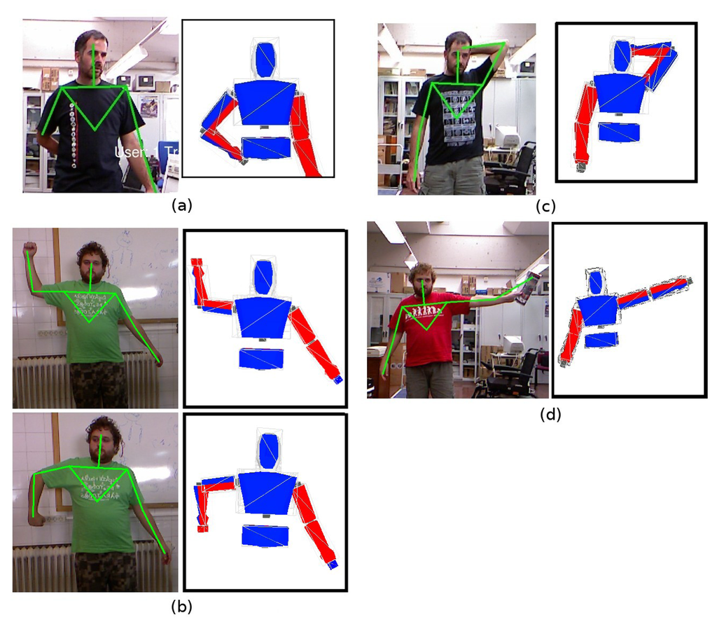 Joint angles can be extracted from the 3D positions provided by the OpenNI tracker. There are several applications and published examples in which the transformation from 3D positions to joint angles is performed. The proposed system, however, is also able to avoid odd poses and guarantee a valid angle configuration for every frame. Figure 4b depicts a situation in which the model adopts a pose that matches 3D centroids provided by the OpenNI tracker and satisfies human motion constraints. Figure 4b shows that the model arm always bends at a valid angle (model limbs have been colored in blue and red to better show this characteristic of the model).