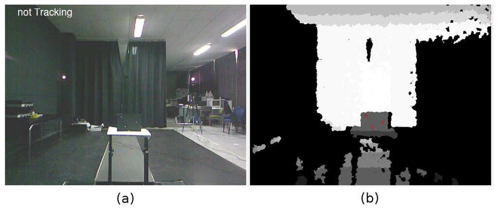 Before the tests can be conducted, it is necessary to calibrate the relative positions of both HMC systems. We have obtained a transformation matrix that translates 3D points between HMCs using three IR markers located on a plane (Figure 5b), plus the IR light spot emitted by the Kinect sensor. The image in Figure 5b shows the plane containing the three markers from the point of view of the PrimeSense sensor. These four points are used by each HMC system to compute the relative pose of the other.