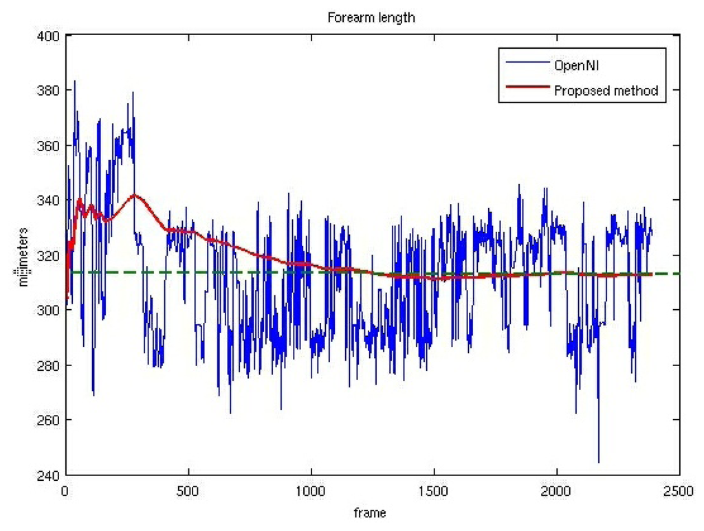 Figure 6 shows the instant right forearm lengths computed as the Euclidean distance between 3D centroids provided by OpenNI. It also shows the instant model forearm lengths, computed using the algorithm detailed in Section 2. The measured forearm length (312 mm) is also depicted. Figure 6 shows convincingly how the forearm length of the model converges to the real value despite the noisy values provided by the OpenNI tracker.