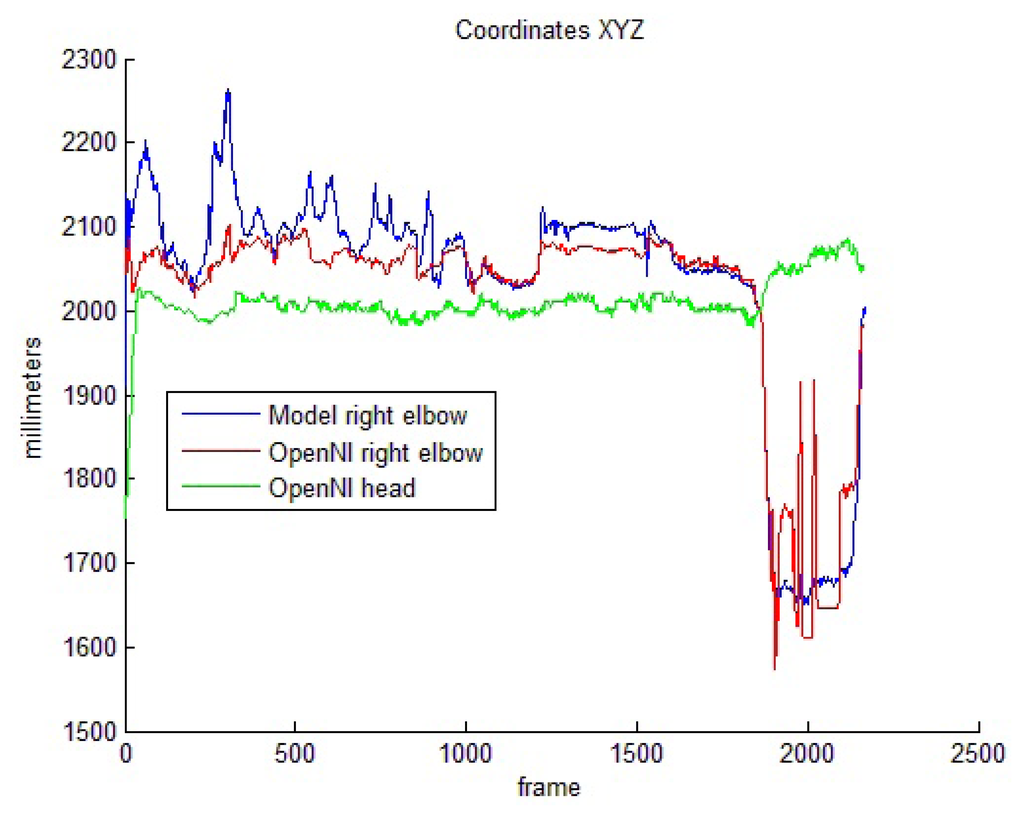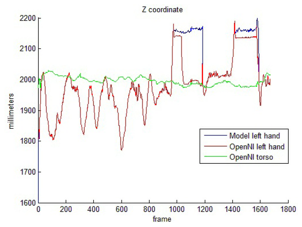Torso-related motion offers a completely different set of results. The performance of the OpenNI tracker decays if the hands move near the torso. Table 4 shows success percentages of around 50% for both hand and elbow pose estimations. The model-based pose reinforcement, in these cases, improves the estimation results significantly, as depicted. In order to better understand these improvements, Figure 8 shows the camera-joint distance for one of the test sequences, in which the performer hides her left hand behind the body two times. The OpenNI tracker usually sets the depth value for the hidden joint to a too close value, with respect to the visible joint (i.e., in frames 1,100–1,200, the hand and the body are overlapped). The model avoids these odd poses and maintains the joints in valid positions.