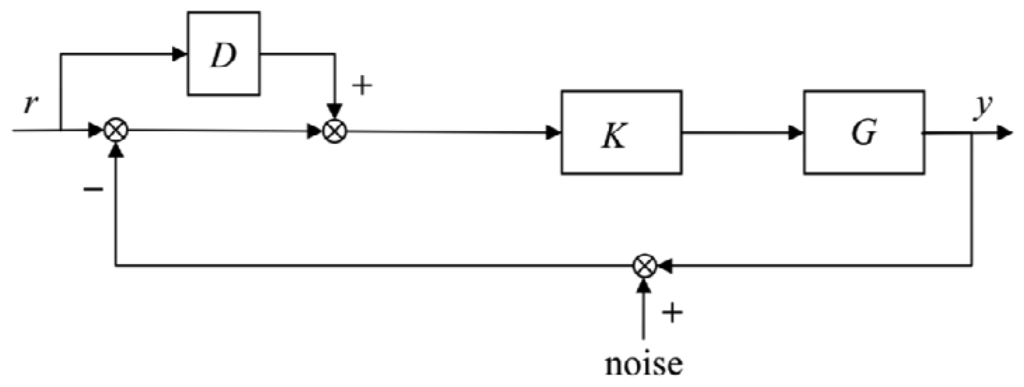 To further enhance the tracking performance of the robust H∞ feedback control in Section 4.2, a derivative feedforward of the reference signal is added to the tacking error. The composite control is thus designed, as shown in Figure 10, where D and K represent the derivative feedforward controller and the robust H∞ feedback controller, respectively, and r and y represent the reference angle and piezo angle, respectively. In the experiment, D is determined by several trials.