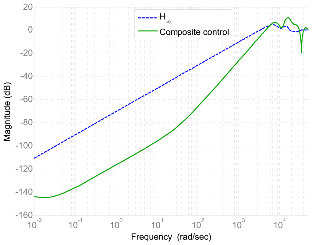 In this paper, the derivative feedforward D is employed to compensate the phase lag within the feedback bandwidth. By transformation, the proposed composite controller can be regarded as a special PD-H∞ composite controller. To represent the tracking performance in frequency domain, the Bode diagram of the sensitivity functions of the H∞ controller and composite controller is shown in Figure 11. It can be seen that the proposed composite controller greatly improve the tracking performance at frequencies lower than 3,500 rad/s. At frequencies higher than 5,000 rad/s, the tracking performance of the proposed composite controller does not hold. Alternatively, the robust stability is guaranteed by the robust H∞ feedback controller at frequencies higher than 5,000 rad/s.