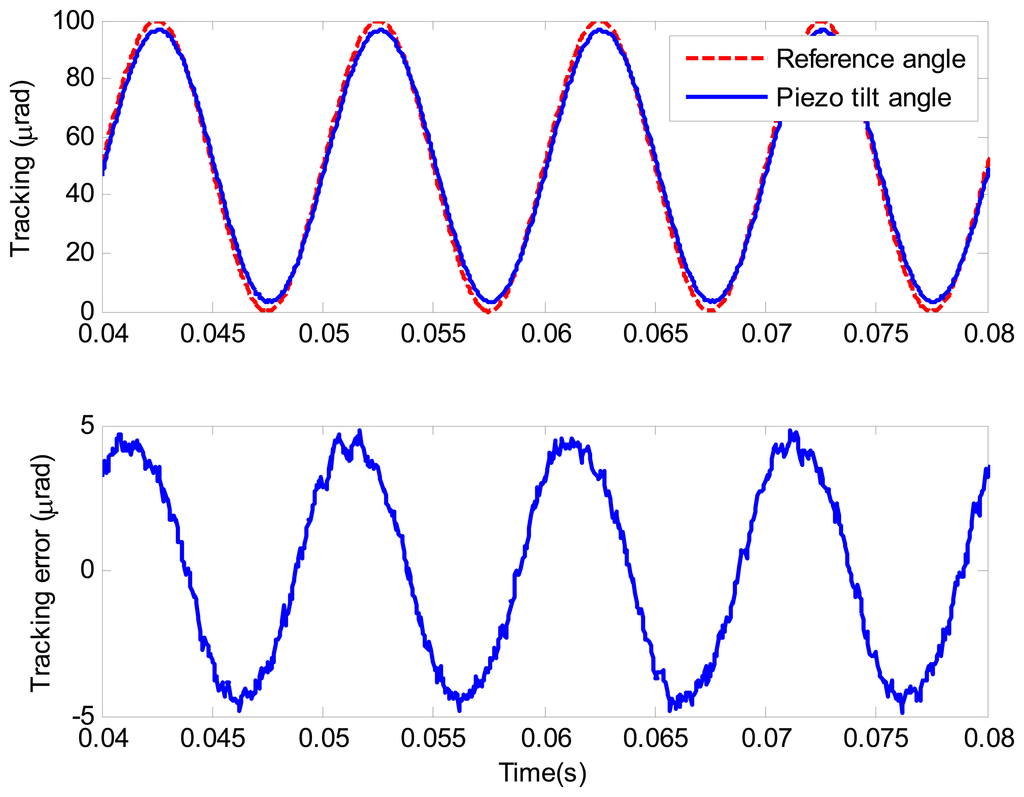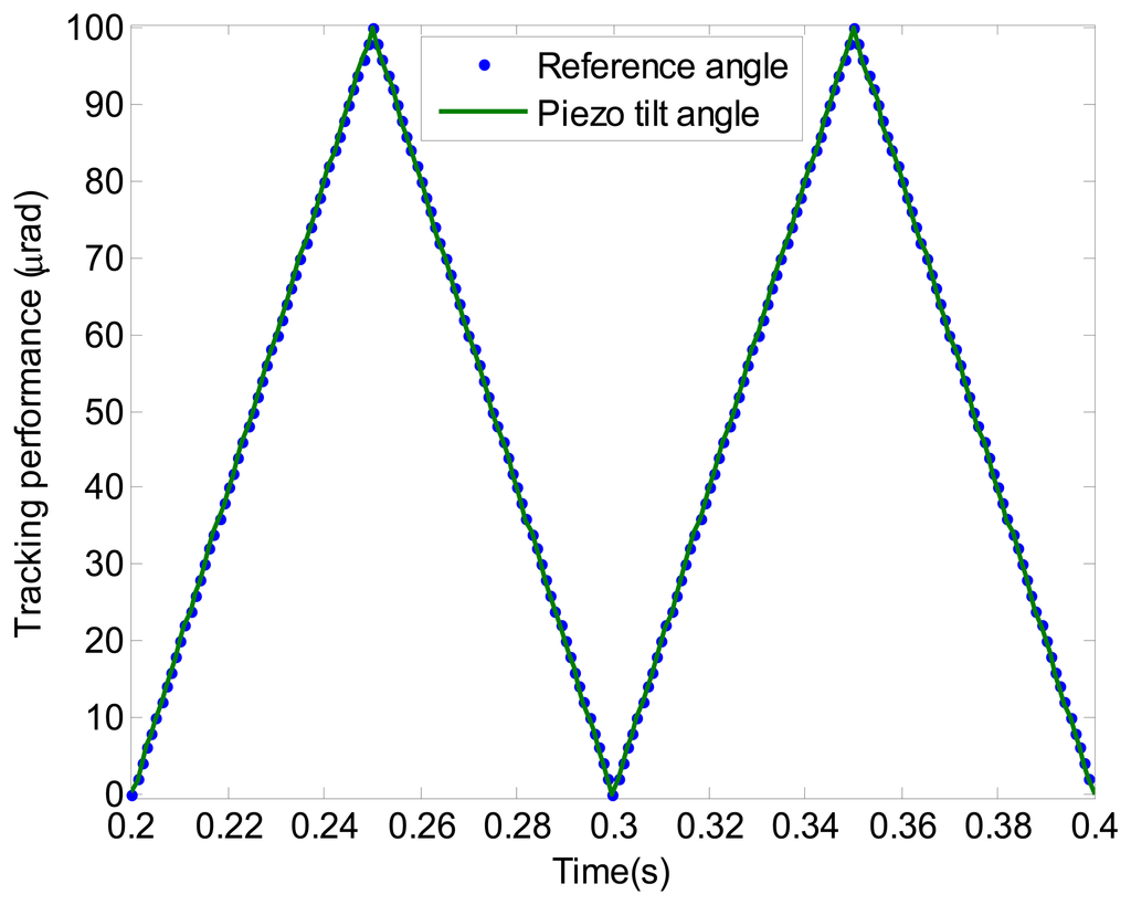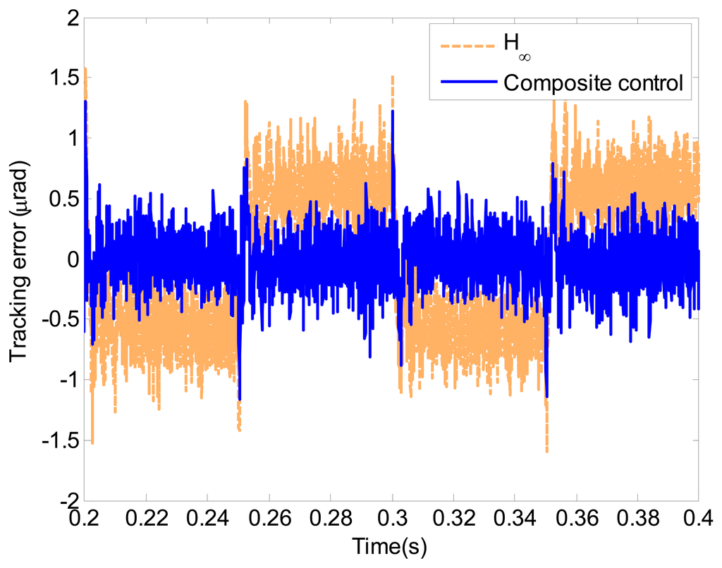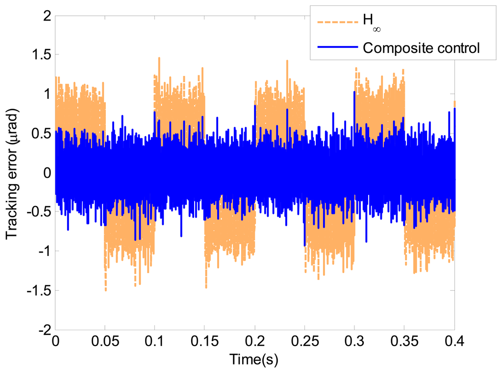 In this section, the simulation study of a triangle wave with the amplitude of 100 μrad and the frequency of 10 Hz is presented. Figure 12 shows the tracking errors of the proposed composite controller and the H∞ controller. The tracking error of the proposed composite control is less than 36% of the H∞ feedback control. The tracking error RMS of the proposed composite control is 0.205 μrad, which is almost equal to the electrical noise. The simulation result indicates that the proposed composite controller presents satisfactory tracking performance.