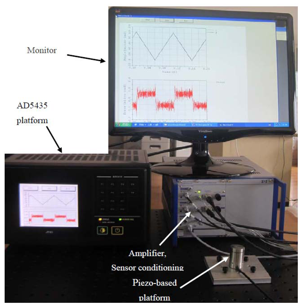 The experimental setup, the measurement strategy and the angle calibration are presented in this section. The constructed piezo platform system consists of a piezo-based platform, SGS sensors, voltage amplifiers, an AD5435 platform and a signal conditioning unit, as shown in Figure 1. The AD5435 platform includes an AD5435 card, a DA card (AD5430-02BK, 8 Ch, 16 Bits) and an AD card AD5430-01, 16 Ch, 16 Bits). In addition, voltage amplifiers, SGS sensors and signal conditioning are installed in a metallic box. The bandwidth of SGS sensors in this paper can be up to 3 kHz, and the resolution is better than 10 nm (RMS). The equivalent angle resolution is 0.2 μrad (RMS).